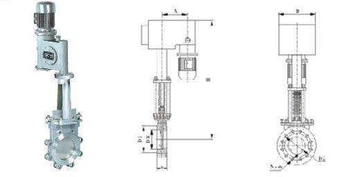 單夾式電液動(dòng)刀型閘閥,凸緣電液動(dòng)刀型閘閥,凸緣電液動(dòng)刀閘閥,凸緣電液動(dòng)刀式閘閥的構(gòu)造圖及主要外形及連接尺寸(mm)