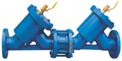 HD42X倒流防止器工作原理是利用介質(zhì)流過進水止回閥時因機械阻力和過流水頭損頭失而減壓,使進口壓力高于泄水閥腔的壓力,而泄水閥膜片上部的壓力為進壓力,膜片上部壓力大于泄水閥腔和彈簧阻力,泄水閥維持關(guān)閉,介質(zhì)正常流動,當(dāng)進口壓力與泄水閥腔的壓力差小于0.02Mpa時,介質(zhì)處于倒流的臨界狀態(tài),這時泄水膜片上部壓力小于泄水閥腔和彈簧的壓力,泄水閥自動開啟,將倒流介質(zhì)排出管外,同時大量空氣進入閥腔,形成空氣隔斷,杜絕介質(zhì)倒流,大于0.02Mpa時泄水閥自動關(guān)閉. 是一種嚴(yán)格限定管道中水只能單向流動的水力控制組合裝置,它的功能是在任何工況下防止管道中的介質(zhì)倒流,以達(dá)到避免倒流污染的目的。 閥后管網(wǎng)水壓高超過閥前進水端水壓力,如第二單向止回閥密封完好,水體不會倒流,此時泄水閥關(guān)閉不泄水,當(dāng)?shù)诙䥺蜗蛑够亻y密封失靈產(chǎn)生滲漏時,泄水閥開啟排水泄壓。 |