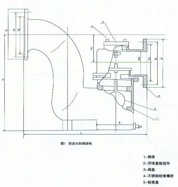 F43X-1.0T防逆水封閥主要由帶存水彎的閥體及浮球蓋板組件等組成,帶浮球的蓋板蓋在閥體的密封閥座上,將閥腔分成內(nèi)外兩部分,內(nèi)腔為清水部分,外腔通排水管道,當(dāng)內(nèi)腔充滿清水時(shí).因位于內(nèi)腔的浮球作用,蓋板壓力降低,易于開(kāi)啟通流。溢流停止后,蓋板可自行復(fù)位.蓋嚴(yán)閥座,從而可嚴(yán)格阻斷臭氣及污水倒灌。如果水池進(jìn)水口浮球閥關(guān)閉良好,數(shù)年不溢流,閥腔無(wú)水,浮球可加重蓋板重量,更好地蓋嚴(yán)閥座,同樣可嚴(yán)格阻隔臭氣及防止雨、污水倒灌清水池。如果污水進(jìn)入閥體外腔,所帶雜物僅能粘附在蓋板外表面,不影響蓋板封嚴(yán)閥座。故該防逆水閥工作可靠,效果好,不易出故障。且當(dāng)有雜物沉淀時(shí).下次溢流時(shí)可自動(dòng)沖出閥體。