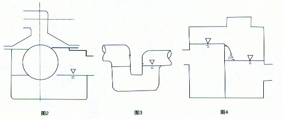 1、本防逆水封閥裝于清水池溢流管上,以前的防逆水封閥(圖2)及存水彎(圖3)或溢流井(圖4)在閥內(nèi)無(wú)水時(shí),均不能阻隔臭氣進(jìn)入清水池,而當(dāng)清水池進(jìn)口浮球鞋閥很好時(shí),尤其是新建水池,往往很少溢流甚至數(shù)年無(wú)溢流,因而,上述三種裝置均不能防止下水道臭氣進(jìn)入清水池,而本防逆水封閥的蓋板浮球結(jié)構(gòu)則可無(wú)論是否有水均可阻隔臭氣,保持清水池良好的衛(wèi)生狀況。