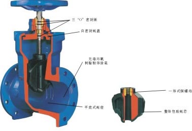 結(jié)構(gòu)特點 1.整體閥蓋暗桿設(shè)計,結(jié)構(gòu)緊湊;閥桿螺母與閘板兩體結(jié)構(gòu),無卡阻現(xiàn)象發(fā)生;直通道,無泄留凹腔;閥桿密封采用“O”形密封圈。 2.有優(yōu)秀的防腐性能,殼體內(nèi),外表面噴涂環(huán)氧樹脂,需要時內(nèi)表面襯搪瓷;連接螺栓采用內(nèi)六角螺栓,頂部膠封。 3.可靠的衛(wèi)生性環(huán)氧樹脂符合衛(wèi)生標準GB/T17219-1998,閘板整體包覆符合衛(wèi)生檢驗的橡膠;閥桿、閥桿螺母等零件采用不受水腐蝕的不銹鋼或青銅等到材料。 適用飲用水、給排水、污水處理、天然氣與煤氣、工業(yè)以及食品等行業(yè)。